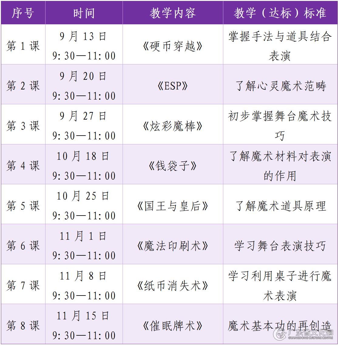 共8课时的奇幻魔术营以“玩中学、学中演、演中创”为教学理念,融合数学、物理、语言、美术等多学科知识,让孩子在轻松愉快的氛围中掌握魔术技巧,提升综合素养。