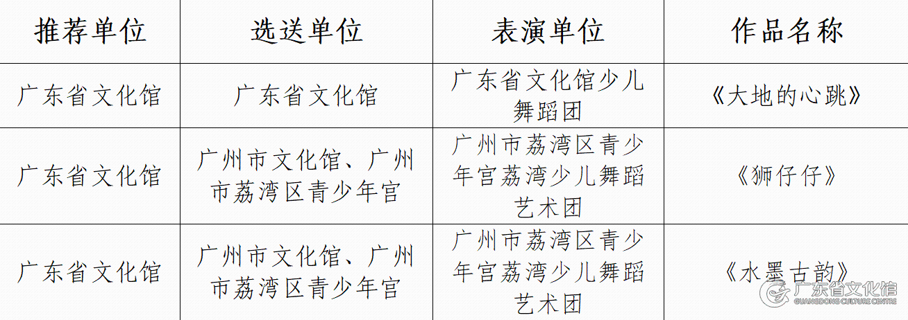 该活动自今年3月启动以来,广东省文化馆面向全省各地文化馆积极开展各门类作品征集,经文化和旅游部全国公共文化发展中心专家组评审,广东省共有10件作品入选线下展演。其中,合唱专场获颁“优秀组织单位”奖牌两个、舞蹈专场获颁“全民美育”奖牌三个、戏曲专场获颁“特色风采”奖牌一个,广东省青少年代表在全国美育舞台上多彩绽放。